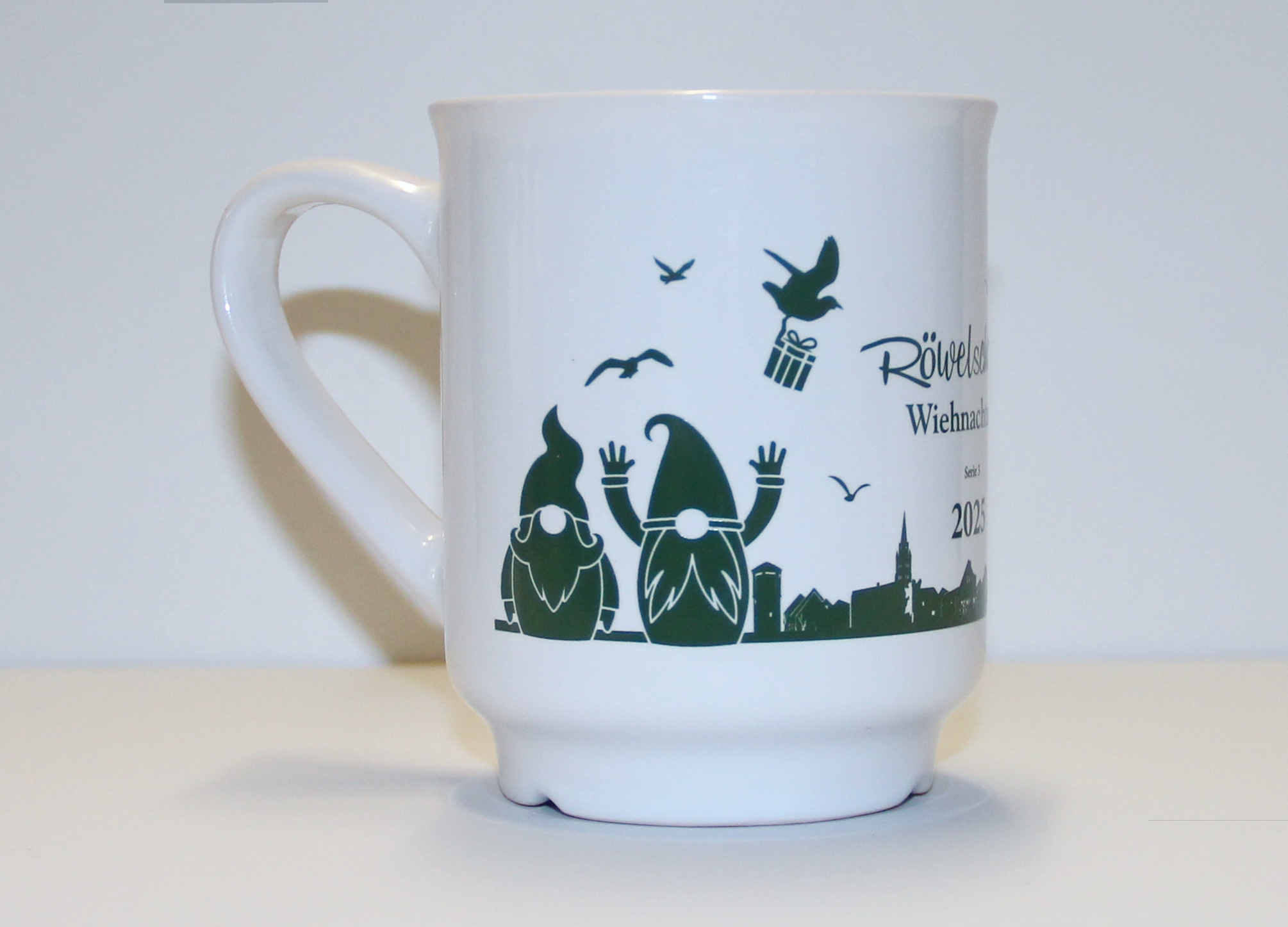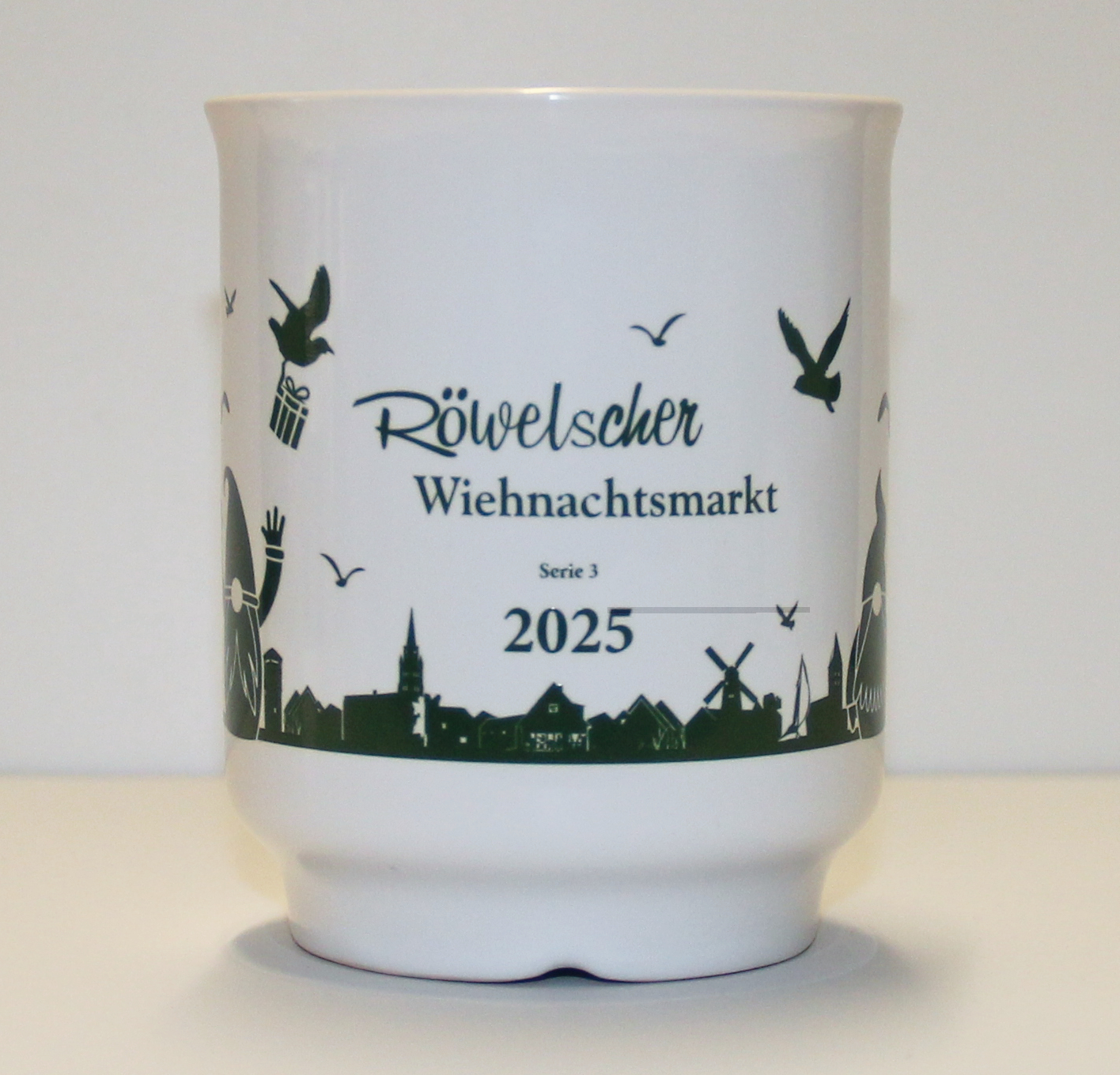 Auch in diesem Jahr setzt der Röwelsche Wiehnachtsmarkt auf Nachhaltigkeit. Die diesjährigen Tassen sind designt und bestellt – und natürlich wieder passend zu den vorherigen Versionen stabelbar!